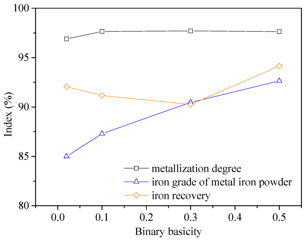Effect of binary basicity on the reduction and separation indexes (reducing at 1350 °C for 25 min with a total C/Fe mass ratio of 1.0, 15% coal blended in pellets).