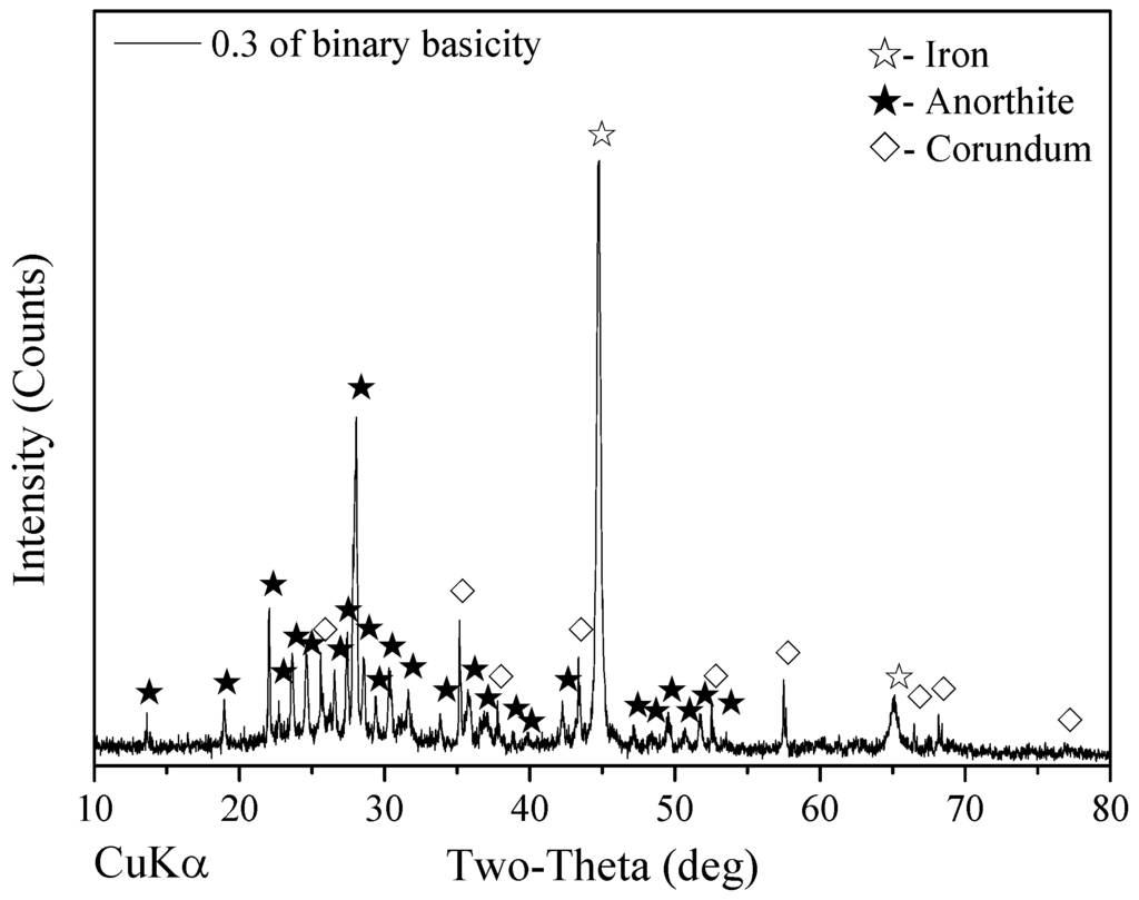 Main minerals in reduced pellets with a binary basicity of 0.3 detected by XRD.