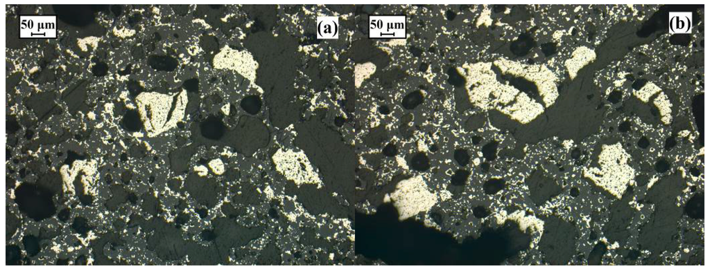 Fayalite and hercynite are detected in the reduced pellets of blends without coal-bearing, as illustrated in Figure 8, leading to a lower metallization degree and iron recovery. Due to the low melting temperature of fayalite, the liquid phase formed easily in the reduction temperature range, and micromelting appearance was observed in the reduced pellets. Distributions of iron grains in Figure 9 demonstrate that metallic iron grains exist at the outer layer of reduced pellets without coal-bearing, and the inner layer is filled with fayalite and hercynite. In contrast, dominant iron minerals are reduced to metallic iron at both the inner and outer layer by blending 15% coal fines in the pellet feed, and minor iron minerals combine with Al2O3 to form a trace of hercynite. Mullite is the main gangue mineral, which inhibits the grain growth of metal iron to a certain extent, so that there are still some metallic iron grains with fine particle size less than 20 μm, resulting in the low iron grade of the metal iron powder after magnetic separation.