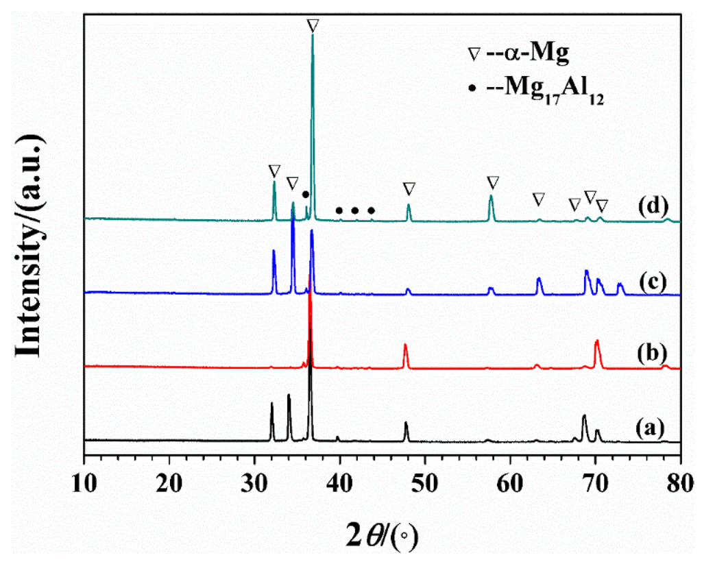 X-ray diffraction (XRD) patterns for AZ63 (a), AZI1.0 (b), AZI1.5 (c) and AZI2.0 (d) alloys.