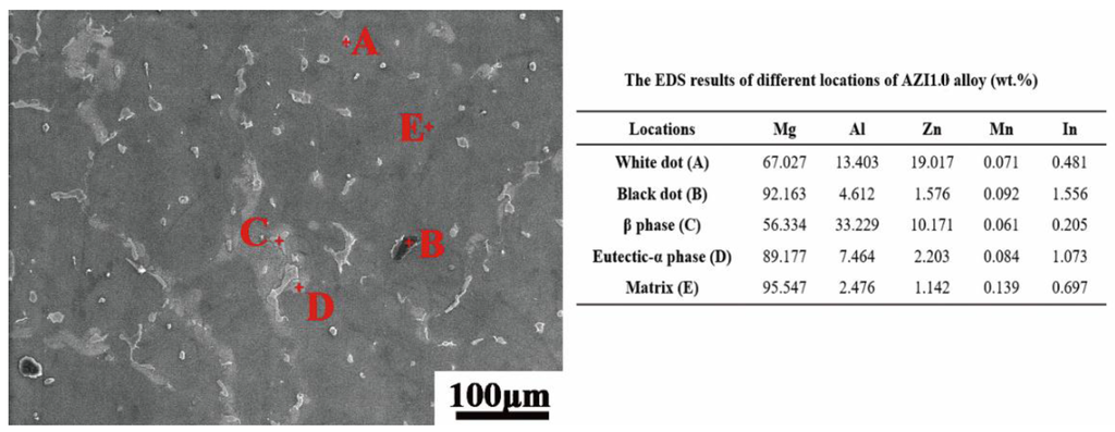 An SEM image of AZI1.0 alloy and the EDS results of different locations are presented in Figure 3. The microstructure of AZI1.0 alloy consists of α-Mg, precipitates in α-Mg and on grain boundaries. The black dot (location B) locates in α-Mg and the eutectic α-Mg phase (location D) contain a higher content of indium and lower content of aluminum and zinc on comparing with the results of β-Mg17Al12 (location C) and white dot (location A). The substrate (location E) has a lower concentration of aluminum, zinc, and indium than the nominal composition of Al 6 wt%, Zn 3 wt% and In 1.0 wt% owing to the segregation effect. Therefore, it can be deduced that the indium favors segregation from the Mg substrate and separate precipitation in α-Mg or in the eutectic α phase. The poor solubility of indium in aluminum and zinc promotes the grain refinement via the segregation process, which provides an interpretation of the phenomenon shown in Figure 2.