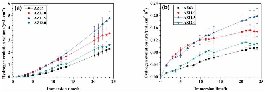 Hydrogen collection is more convenient than weight-loss measurement in studying the corrosion rate dependence on time due to hydrogen evolution rather than reduction of oxygen being the dominant cathodic reaction []. The variation of hydrogen volume over a given period can be employed in calculating the average corrosion rate in situ []. Figure 4 illustrates the hydrogen evolution volume and rate with immersion time over a 24 h period. The corrosion rate of the AZ63 and AZI alloys can be ranked as AZ63 < AZI2.0 < AZI1.0 < AZI1.5. The indium addition promotes the corrosion rate of the alloys; this being probably due to the increasing amount of precipitates both in α-Mg and on the grain boundaries (see Figure 2), which act as the cathode in forming a micro-cell with α-Mg during the corrosion. The presence of β-Mg17Al12 phase in Mg-Al alloys has two influences on their corrosion behavior, a galvanic cathode for promoting the corrosion and a barrier for inhibiting the corrosion []. The corrosion rate of AZI2.0 alloy is not consistent with the increasing tendency of the corrosion rate mentioned above and could be attributed to the barrier effect aroused by the continuous net structure of the β-Mg17Al12 phase on the grain boundaries as shown in Figure 2d, which decreases the corrosion rate by the barrier effect. This result is also consistent with Liu’s work [], which suggested that the barrier effect would perform effectively once the β phase was distributed continuously around the α-Mg substrate.
