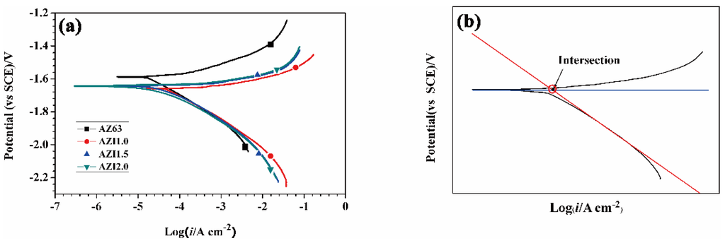Potentiodynamic polarization curves of AZ63 and AZI alloys after 1 h immersion in 3.5 wt% NaCl at 25 ± 1 °C (a) and sketch map of polarization curve for Tafel extrapolation (b).