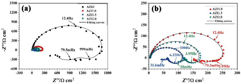 The EIS spectra of AZ63 and AZI alloys obtained at open circuit potentials after 3600 s immersion are shown in Figure 7. The Nyquist diagrams of the investigated alloys are comprised of one capacitive loop at high frequency and two inductive loops at intermediate and low frequencies. The capacitive loop is related to the property of the electric double layer at the electrode/electrolyte interface []. Two inductive loops in the fourth quadrant are due to the chemical reaction of Mg+ with H2O on the breaking area of the corrosion products film and the desorption of corrosion products respectively [,].