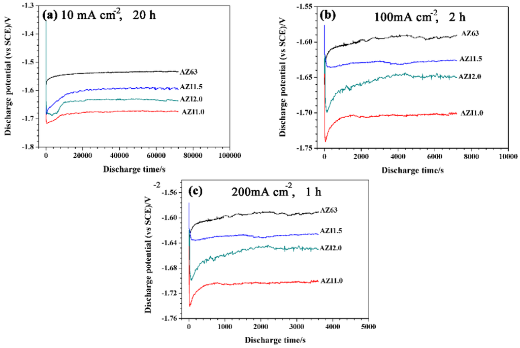 The galvanostatic discharge behaviors of the AZ63 and AZI alloys were investigated by impressing three anodic current densities at 10, 100 and 200 mA·cm−2, respectively. The different discharge times, 20 h, 2 h, and 1 h, corresponding to the current densities are designed for comparison of the current efficiencies at the equivalent discharge capacity. The increasing current densities ranging from 10–200 mA·cm−2 aim at studying the discharge behavior of magnesium anodes for different applications []. The current efficiency given in literature [] is shown in Equation (4):