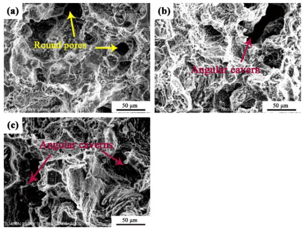 Corroded morphologies of AZI1.0 alloys at different discharge current densities after removing the products: 10 mA·cm−2, 20 h (a), 100 mA·cm−2, 2 h (b) and 200 mA·cm−2, 1 h (c).