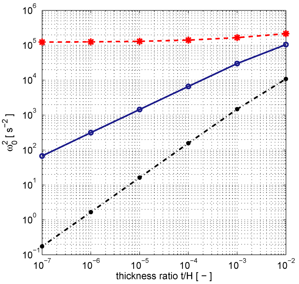 Asymptotic analysis of fundamental frequency. Asymptotic pattern of lowest eigenfrequency with respect to thickness ratio approaching zero. Different shells of revolution: elliptic - red dashed line with stars, parabolic - blue solid line with circles, hyperbolic - black dashed-dot line with bullets.