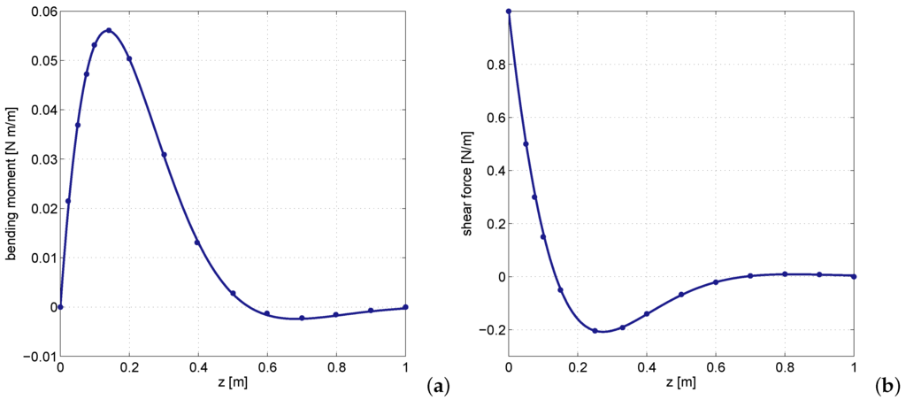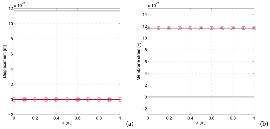 The present classical benchmark is here adopted as a tool for calibrating the model with respect to parameters n and p, i.e., mesh discretization (refinement) and order of interpolation (refinement), and for a given accuracy level. To this end, a reference solution proposed by Timoshenko and Woinowsky-Krieger [55] for semi-infinite circular cylindrical shells in axisymmetrical bending, is here taken into consideration for comparison and accuracy assessment. The structural behavior, which shifts from shear-flexural near the loaded edge to membrane dominated at the clamped boundary, is correctly reproduced by the NURBS-based collocation approach, as can be seen in Figure 5a,b, where and are plotted, respectively, for an overkilling discretization with and with a relative error norm below , together with values computed through the reference solution at selected locations. The results are in agreement, plus the static boundary condition is exactly satisfied in solution.