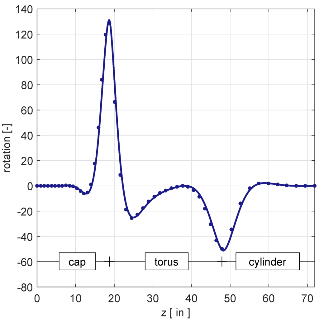Given the interesting performance of standard Lagrange interpolation spaces, for the implementation of 1D collocation methods for shells of revolution, reported by previous researches [13,14,15,16], in what follows, we explore the superior accuracy of the NURBS approximation in conjunction with the collocation approach. The attractiveness of this approximation is twofold: the NURBS high regularity suggests the possibility of obtaining smooth solutions even with low order approximation and low number of degrees of freedom, the capability of describing complex geometries is interesting especially from a structural design point of view, when constructing geometrical models from measured data is required.