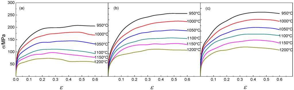 The flow stress-strain curves of experimental BSTMUF601 super-alloy at the temperature range of 950 °C–1200 °C and at strain rates of 0.2, 5 and 10 s−1 are shown in Figure 1. As expected, the flow stress is sensitively dependent on both the deformation temperature and strain rate. At the lower strain, the flow stress increased rapidly with the increase of the strain, caused by the increase of the average value of dislocation density which appears to have higher resistance to further compression. Some of the stress curves showed a broad and flat peak, which indicates the occurrence of dynamic recrystallization (DRX) and dynamic recovery (DRV) [10,11]. The flow stress decreases with the increase of deformation temperature at the same strain rate, and increases with the decrease of the strain rate at the same deformation temperature. This is easy to understand because the mobility of the grain boundary and dislocation could be accelerated or improved at a higher temperature, while it would take a longer time at a lower strain rate, according to the higher effect of the apparent activation energy of the deformation and lower shearing stress. Additionally, higher deformation temperature and lower strain rate could be beneficial for completing the DRX process including nucleation and growth.