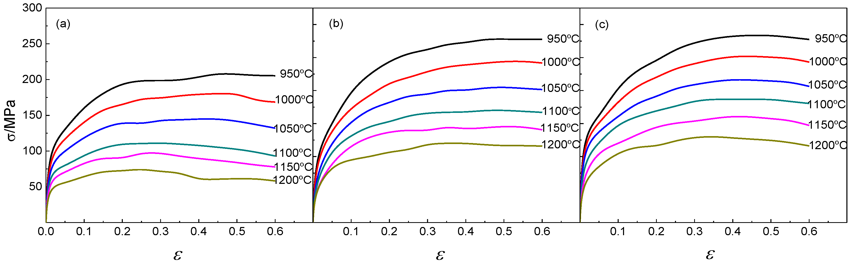 Flow stress-strain curves of BSTMUF601 super-alloy under different strain rates: (a) 0.2 s−1; (b) 5 s−1; (c) 10 s−1.