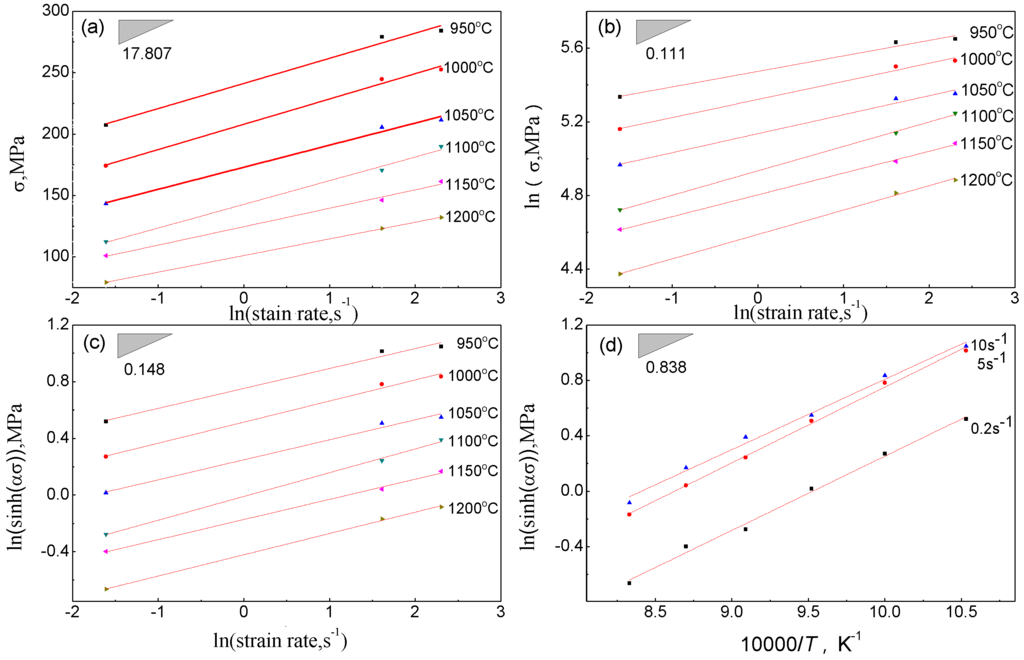 Generally, the different descriptions of the Arrhenius-type equations are used for different regions. The exponential law in Equation (5) could predict the flow stress for the high stress level while the power law in Equation (4) could only be used for the low stress level. However, the hyperbolic sine law in Equation (6) is applicable for both low stress and high stress levels [8]. In the study, the flow stress ranges from 50 to 300 MPa; therefore, the hyperbolic sine law in Equation (6) is the most optimum constitutive equation. Obviously, the material parameters α, n, n1, n2 and Q should be identified at first to analyze the flow behavior of the studied steel, and according to reference [14], α = n1/n2.