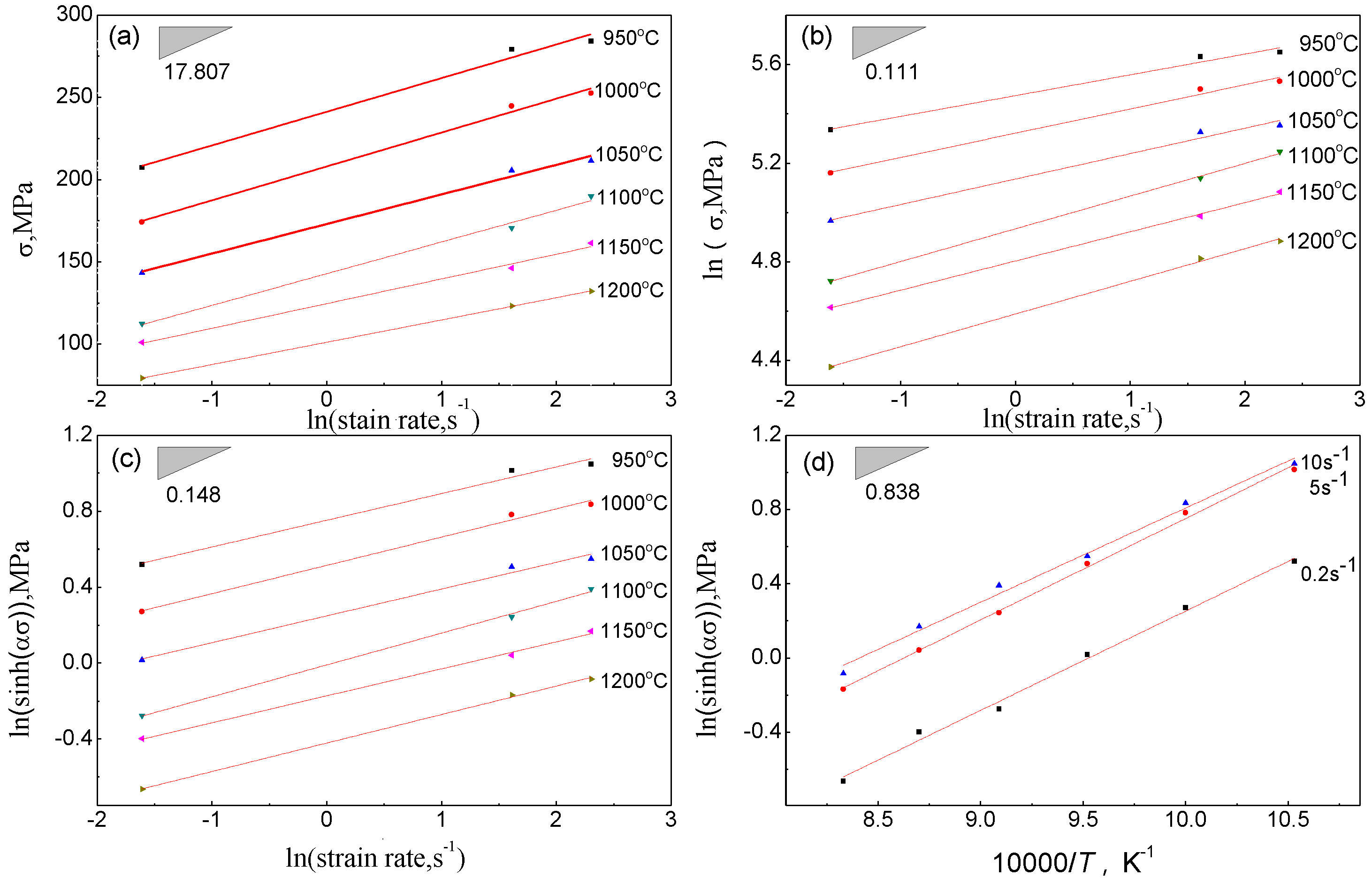 where is the strain rate (s−1), Q is the apparent activation energy of deformation (J/mol), R is the universal gas constant (8.314 J·mol−1·K−1), T is the absolute temperature (K), σ is the flow stress (MPa), n1, n2, n are material parameters which are called the stress exponents, A, A1, A2, are material parameters which relate to the strain rate–sensitive parameter.