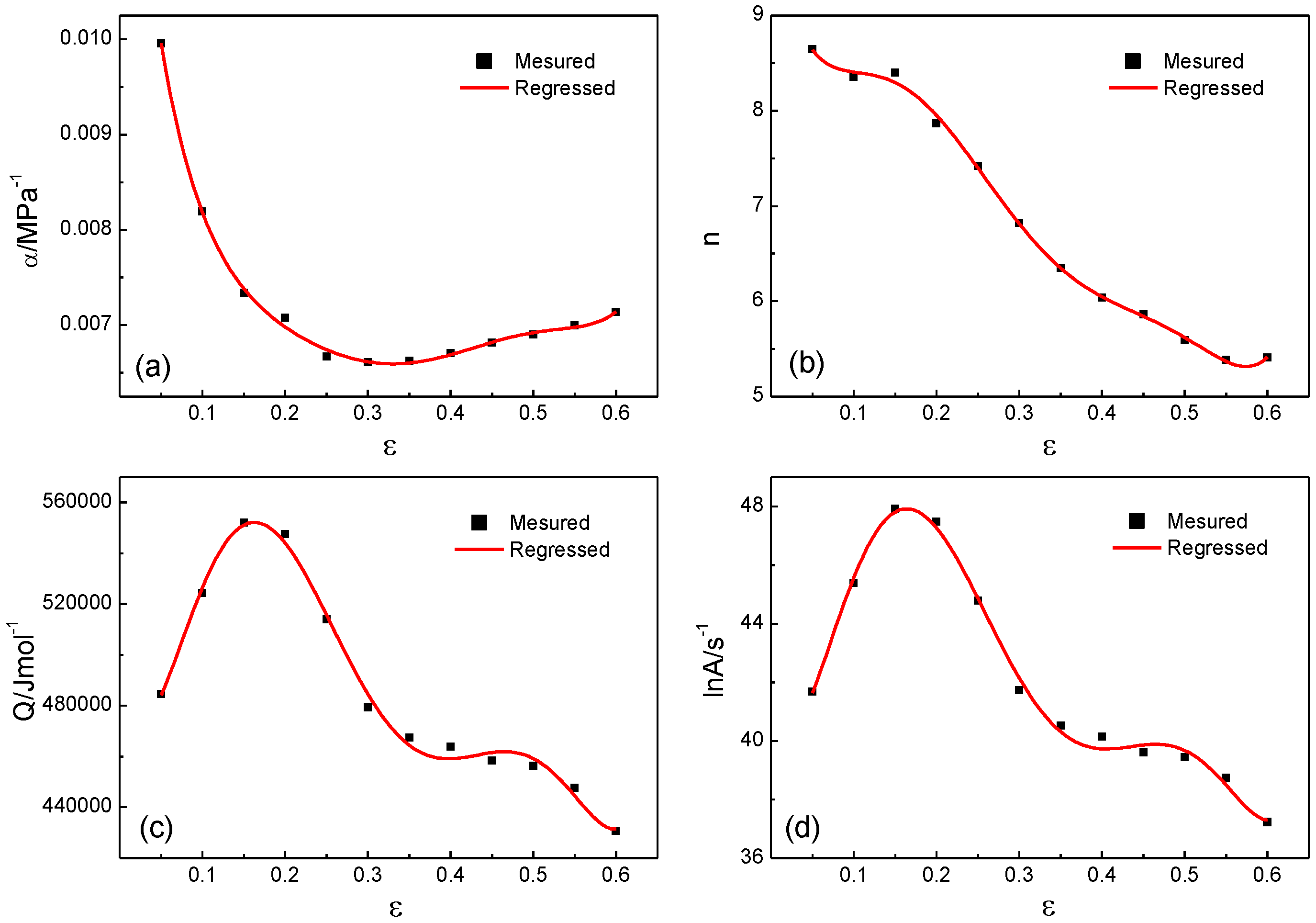 Relations between material parameters and (a) α; (b) n; (c) Q; (d) lnA.