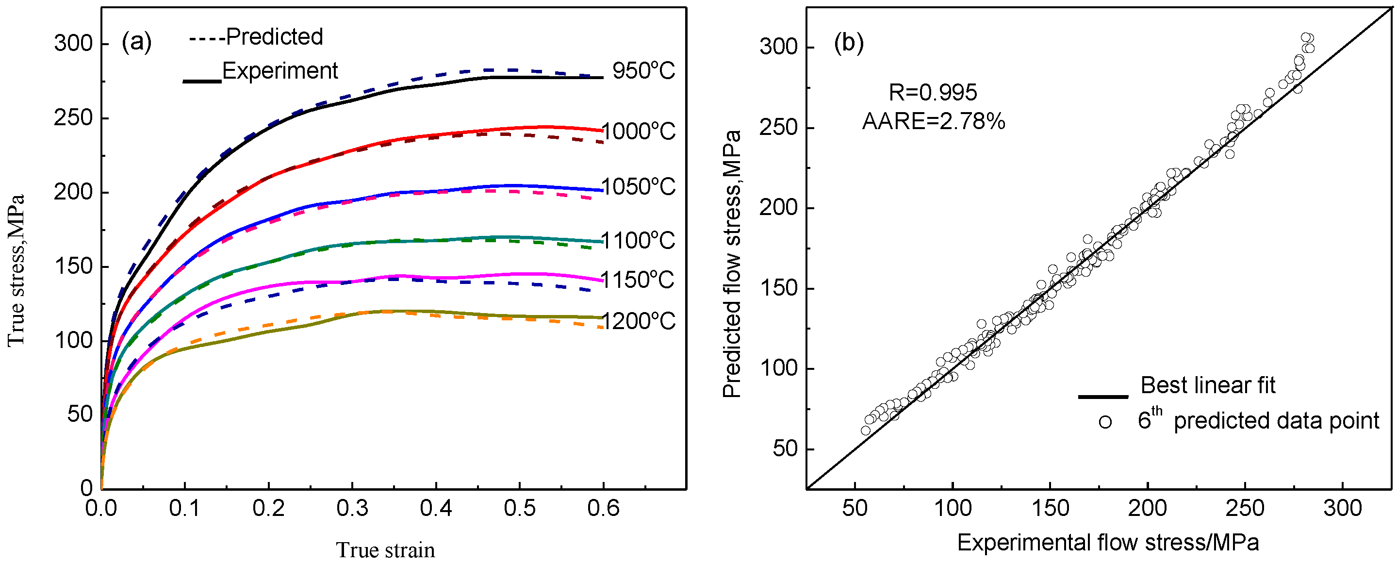(a) Comparisons between predicted and experimental flow stress; (b) Correlation between predicted and experimental flow stress.