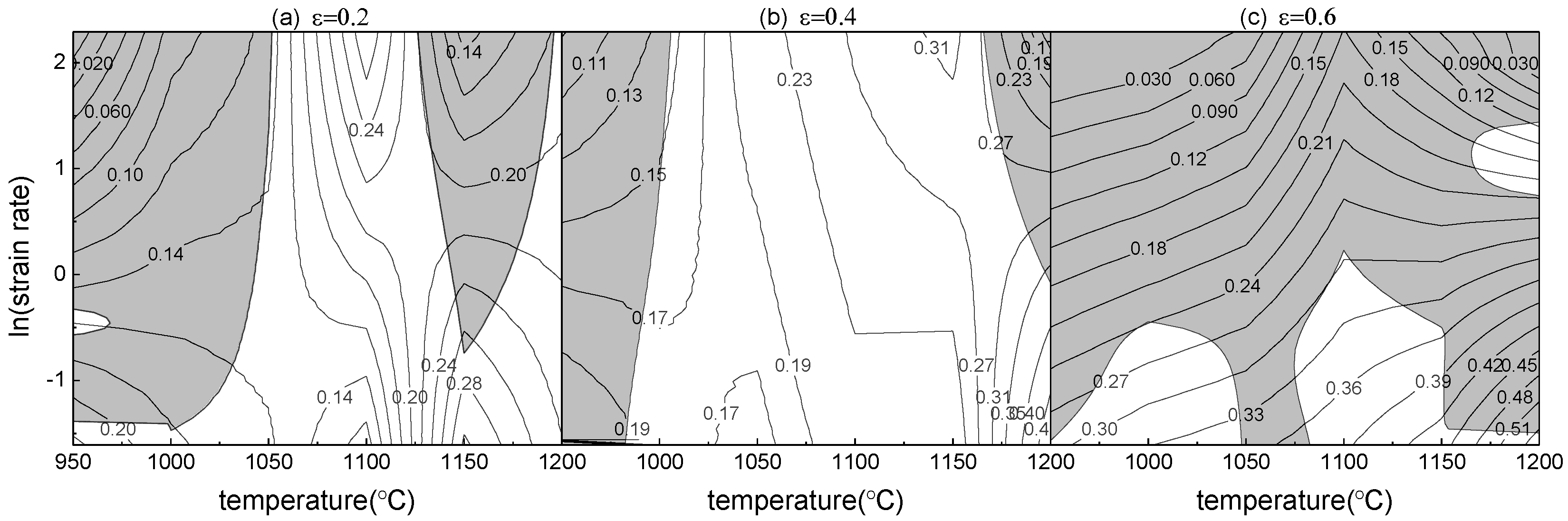 The function relationship between lnσ and ln is obtained by cubic curve fitting, and then the strain rate sensitivity exponent m can be obtained. According to Equation (10), the efficiency of power dissipation η was obtained. The power dissipation map is obtained by plotting the parameter η against temperature and strain rate for different strains in the form of a contour map. According to Equation (11), the value of the instability coefficient was calculated. The instability map can be obtained by plotting the instability coefficient against temperature and strain rate for different strains where the negative values of the instability coefficient, gray areas, indicate flow instability regions. The processing maps for BSTMUF601 super-alloy obtained in the temperature range of 950 °C–1200 °C and at the strain rate range of 0.2, 5 and 10 s−1 at true strains of 0.2, 0.4 and 0.6, through superimposing the instability maps on the power dissipation maps are shown in Figure 5, respectively.