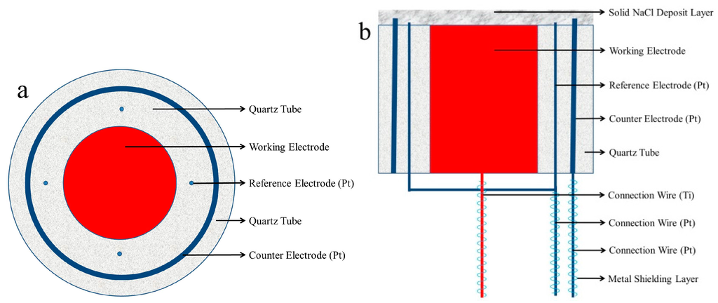 A special three-electrode system was built for the in situ electrochemical measurements in this particular environment (shown in Figure 1) []. To decrease the resistance of the solution and achieve a uniform electric field, the reference electrodes consisted of four platinum wires with a diameter of 0.5 mm, and the counter electrode was a circular strip of platinum foil about 0.2 mm wide. All potential values in this paper were reported versus this platinum reference electrode. The working electrode, pure Ti, was a rod with a length of 10 mm and a diameter of 5 mm. The three electrodes were in quartz tubes, which acted as insulators. All the gaps were sealed by a high temperature inorganic glue [,,]. To decrease the interference of the furnace electric current, the connection wire was covered with a metal shielding layer. After deposited a solid NaCl layer, the three-electrode system was directly put into the furnace at the desired temperature for in situ electrochemical measurements.