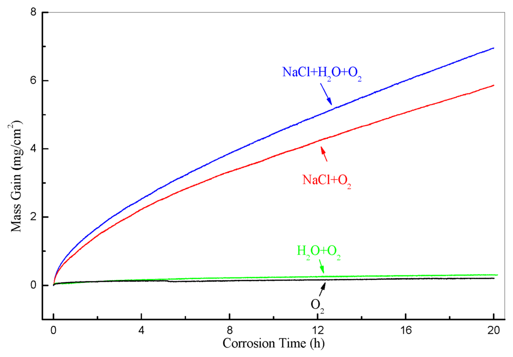 In this work, the corrosion experiments were conducted under the following corrosion environments: solid NaCl deposit layer in a wet O2 flow at 600 °C (NWO600); solid NaCl deposit layer in a dry O2 flow at 600 °C (NO600); wet O2 flow at 600 °C (WO600); and dry O2 flow at 600 °C (O600). The specific environmental parameters have been presented in Table 1.