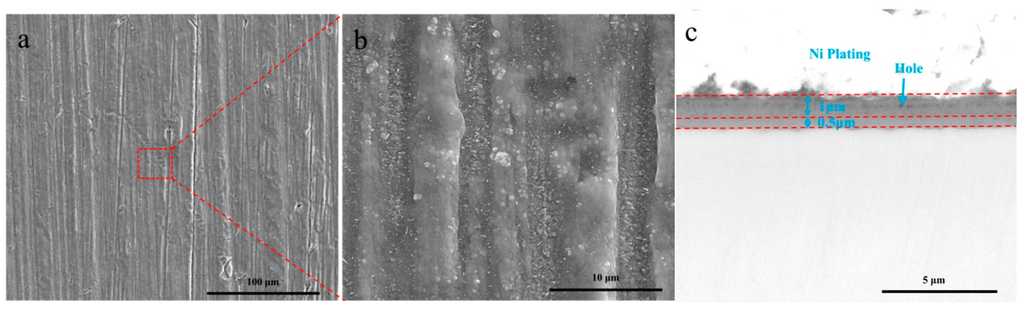 Figure 3 shows the surface and the cross-sectional morphologies of pure Ti after the samples were exposed in O600 for 20 h. It indicates that a compact and even oxidation scale is formed on the sample surface after 20 h exposure in pure O2 at 600 °C, and its thickness is about 1 μm. Figure 4 shows the surface and the cross-sectional morphologies of pure Ti after the samples were exposed in WO600 for 20 h. These morphologies (Figure 4a–c) present that the oxidation scale is compact and even. As shown in Figure 4c, its thickness is about 1.5 μm, which is a little thicker than that of O600 (Figure 3c). This means that pure Ti suffers more serious corrosion in the wet O2 flow, which agrees with the results of the mass gain in Figure 2. Furthermore, when pure Ti is exposed in the wet O2, the oxidation scale is layered and can be divided into two layers: the inner layer and the outer layer. The inner layer is compact, and its thickness is about 0.5 μm. The outer layer is porous (containing hole marked in Figure 4c), and its thickness is about 1 μm.
