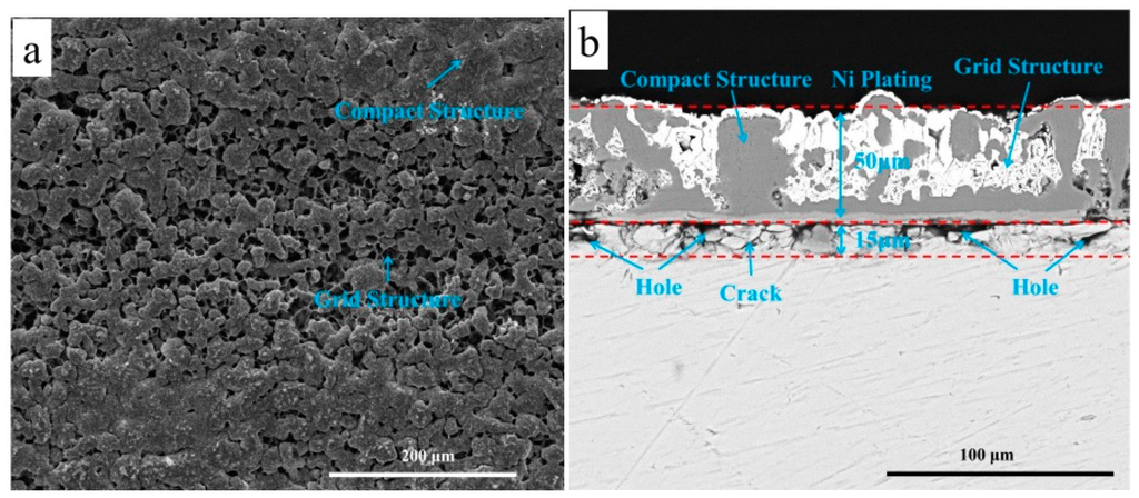 The surface and the cross-sectional morphologies of pure Ti after 20 h exposure in NO600 are shown in Figure 5. It can be observed that the corrosion product scale contains the compact structure products and the grid structure products. The compact structure products (marked in Figure 5a,b) are very complete and uniform. The grid structure products (marked in Figure 5a,b) contain lots of through holes (filled with Ni plating, as shown in Figure 5b) penetrating the corrosion scale. These through holes are the fast diffusion path for corrosion medium. Underneath the corrosion scale, a loose layer, containing some holes (close pores), is formed within the substrate due to the diffusion outward of Ti. The thickness of the corrosion products scale is about 60 μm, while that of the loose layer is about 12 μm.