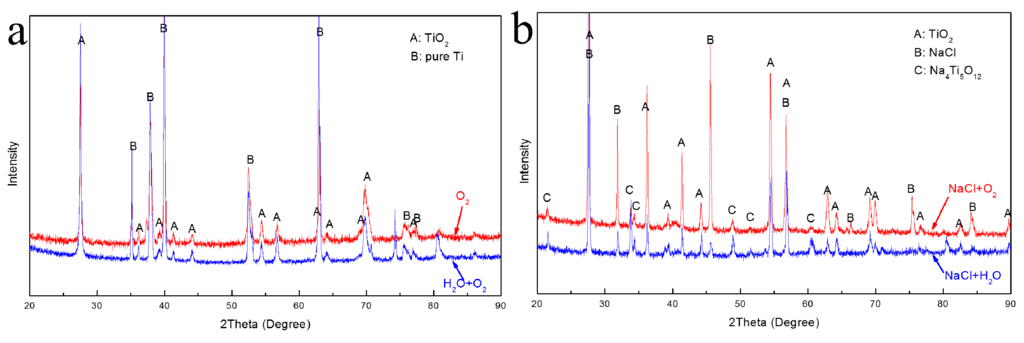 Figure 7 shows the XRD patterns of the corrosion products. Figure 7a shows that only TiO2 is formed on the surface of pure Ti after 20 h exposure in O600 and WO600 (pure Ti identified in Figure 7a is the substrate). The XRD patterns in Figure 7b show that, when pure Ti is exposed in the presence of a solid NaCl deposit (NO600 and NWO600), a mixture of corrosion products (containing Na4Ti5O12 and TiO2) forms on the sample surface with some residual NaCl. In Figure 7b, it also appears that the intensity of diffraction peaks of Na4Ti5O12 is larger in NWO600 than in NO600. This means that the water vapor enhances the formation of Na4Ti5O12 in the presence of a solid NaCl deposit.