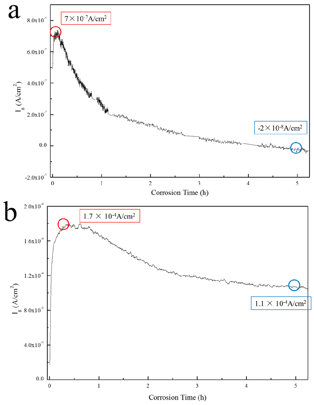 Figure 8 shows the galvanic corrosion current (Ig) as a function of time for the Pt–Pt couple under NWO600 and the Ti–Pt couple under NWO600. In Figure 8a, Ig of the Pt–Pt couple under NWO600 increases quickly to 7 × 10−7 A/cm2 in the early stage due to the increase of test temperature and then decreases form the top to −2 × 10−8 A/cm2 with time varying from 0 to 5 h. Ig of the Ti–Pt couple under NWO600 (Figure 8b) is also divided into a fast increase stage and then a decrease stage. Ig of the Ti–Pt couple under NWO600 is about three orders of magnitude larger than that of the Pt–Pt couple under NWO600, with the maximum value about 1.7 × 10−4 A/cm2.