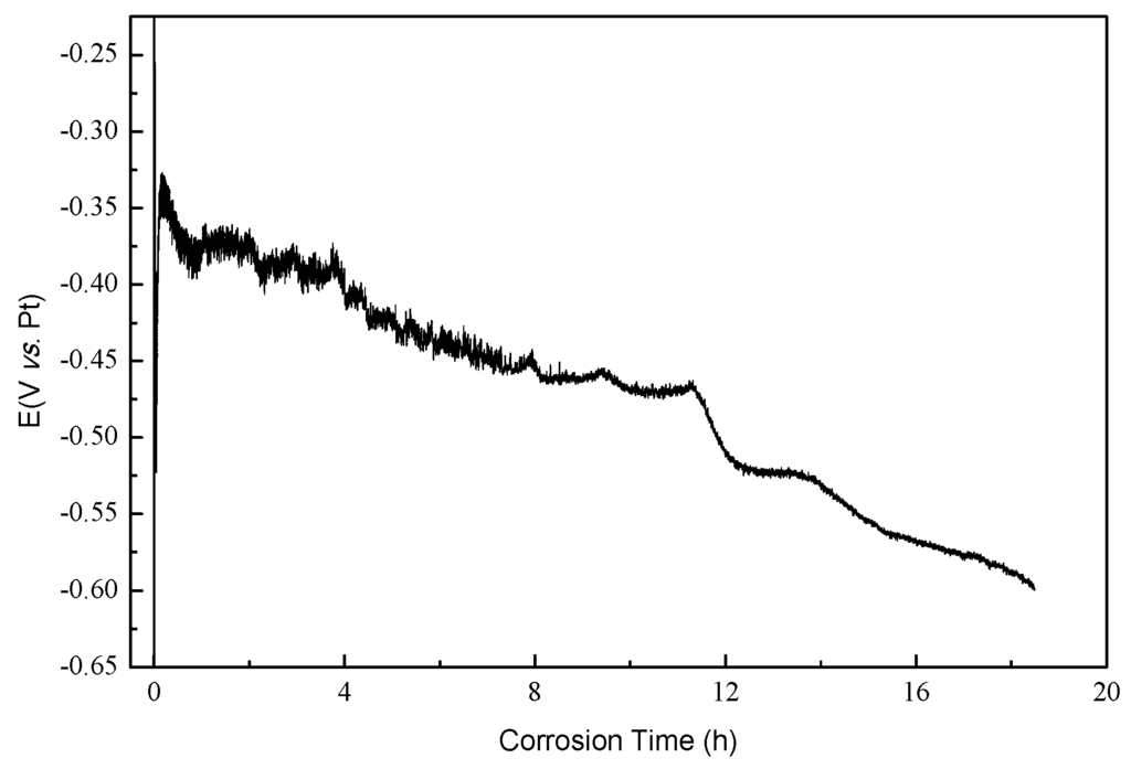The variation of open circuit potential (EOCP) with corrosion time for pure Ti under NWO600 is presented in Figure 9 and show that EOCP increases quickly to −0.35 V vs. Pt in the early stage due to the increase of test temperature, and then it always declines with corrosion time to −0.6 V vs. Pt after 20 h exposure.