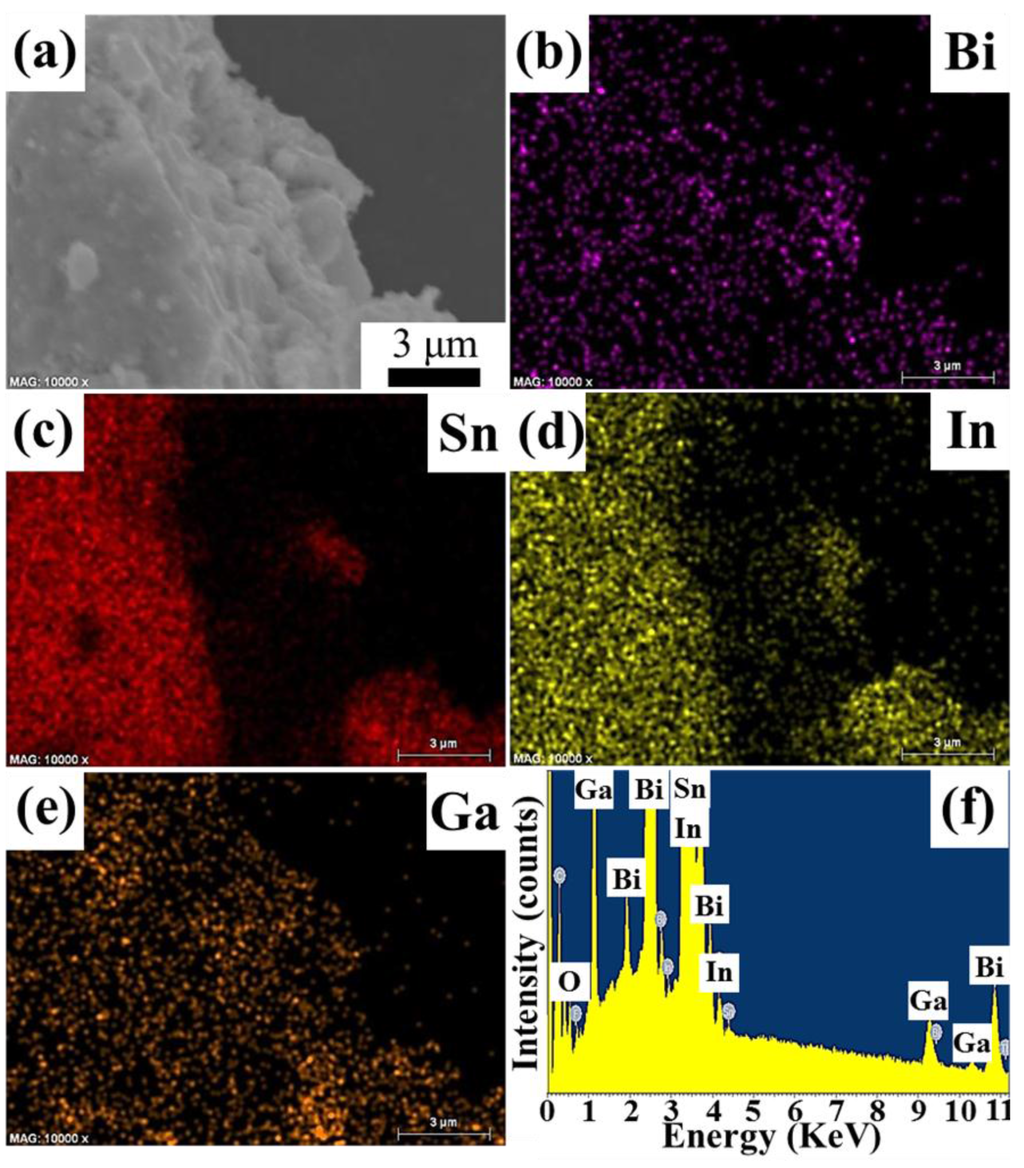 Figure 3b–e), Sn overlapped together with In, referred to as In0.2Sn0.8 IMC, and there was a broad distribution of Ga, which informed the formation of a specific Ga0.9In0.1 IMC between In and Ga. Furthermore, energy-dispersive X-ray spectroscopy (EDS) analysis (