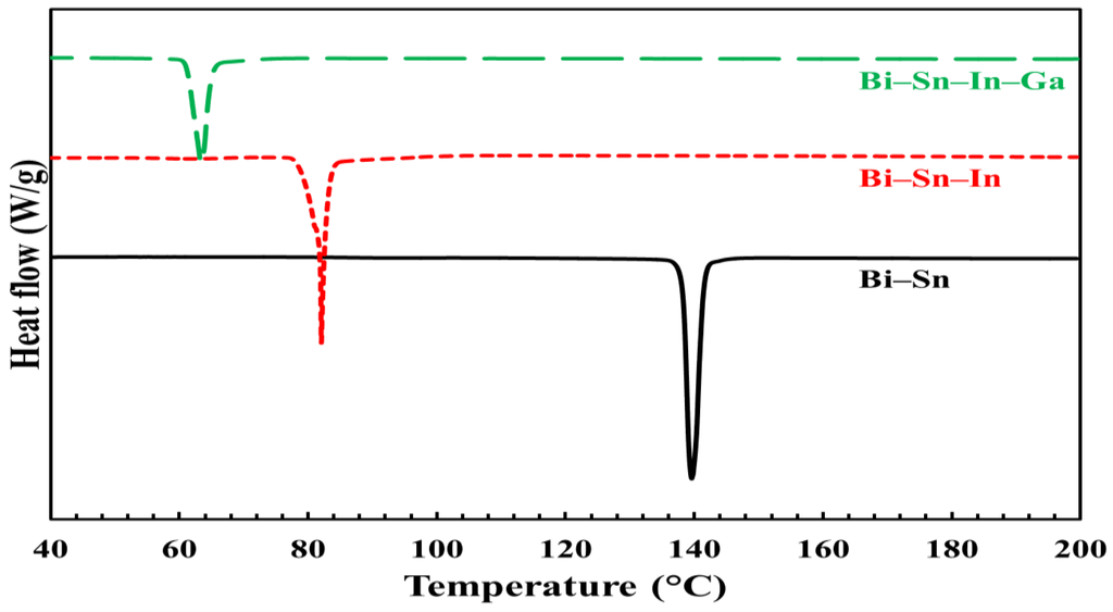 Figure 5 show the thermal behavior of Bi-based solder powders. The prominent endothermic peak of the Bi–Sn–In solder powders shifted to 82.0 °C from the Bi–Sn solder powders having a peak at 139.6 °C when the content of In was increased to 23.8 wt.%. Continuously, the addition of 4.8 wt.% Ga shifted the peak even more, to 60.3 °C. Thus, the addition of an appropriate amount of In and Ga shifted the endothermic peak to the pre-determined melting point of the solder powders. It is noteworthy that a slight shoulder was observed on the left side of the melting point peak for the Bi–Sn–In solder powders. The appearance of the shoulder is a result of the formation of an In-rich phase. The addition of 4.8 wt.% Ga into the Bi–Sn–In solder system also resulted in the formation of various Ga0.9In0.1, BiIn, and In0.2Sn0.8 IMCs. Because such solid solutions have relatively high melting points due to their covalent bonds, the melting ranges of the Bi–Sn–In and the Bi–Sn–In–Ga solder powders became broader [