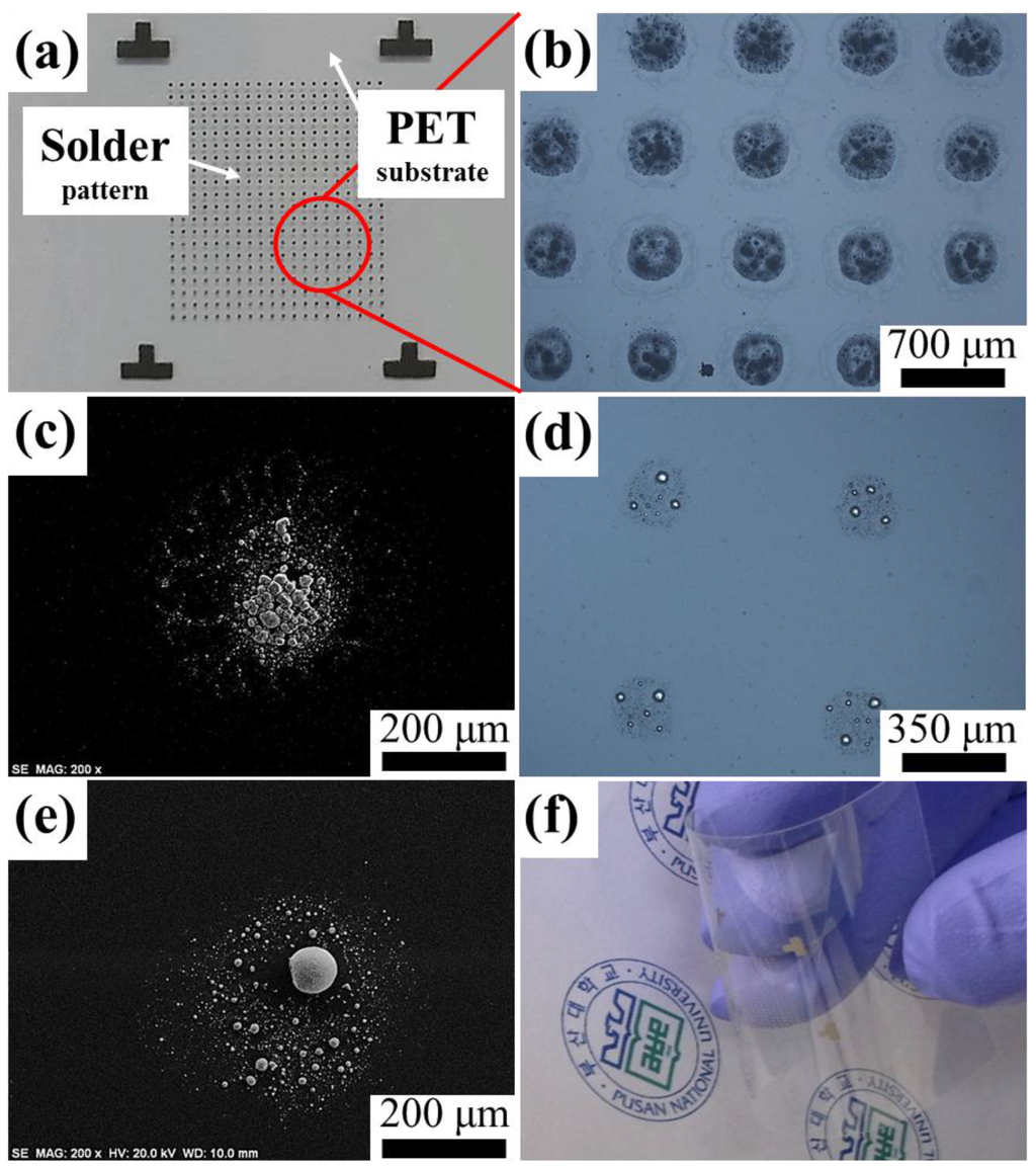 Figure 7f. As a result, the as-reflowed spherical solder bumps were distributed, but the small size of the solder bumps were dispersed around the main solder bumps and were strongly bonded on the PET substrate.