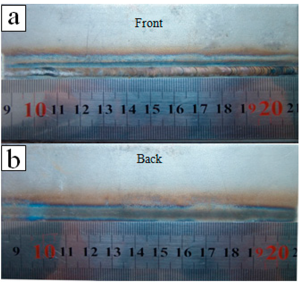 The dimensions of the welding specimens were 120 mm × 60 mm × 3 mm. The oxide film on the welding location was physically and chemically removed prior to welding. Figure 1 shows the weld joint of 443 stainless steel. The cross-section of the joint was prepared using the standard polishing technique and then etched in FeCl3 reagent before observing the metallograph.