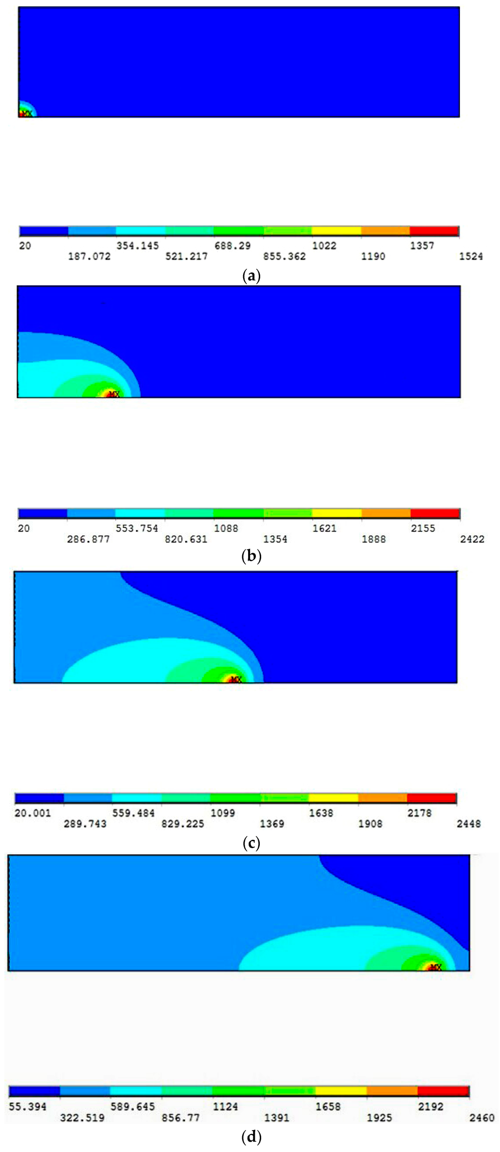 Figure 4 shows the simulation temperature field at different times during the welding process. From Figure 4a, it can be observed that the highest temperature is relatively low, which is 1524 °C. The temperature gradient from the weld bead center to the base metal is large. It can be explained by the total heat input being little and the temperature of the workpiece being low in the beginning stage of welding. The heat radiation is fast, and the pool width is smaller. With the advancement of welding, the highest temperature of the weld bead center increases gradually and tends to be stable. It is shown in Figure 4b,c, with preheating the un-welded region, that the temperature gradient decreases. The fusion width increases and tends to be constant gradually. When the welding is about to end, the decrease of the heat dissipation rate leads to the highest temperature, and the weld bead width increased slightly, which can be observed from Figure 4d.