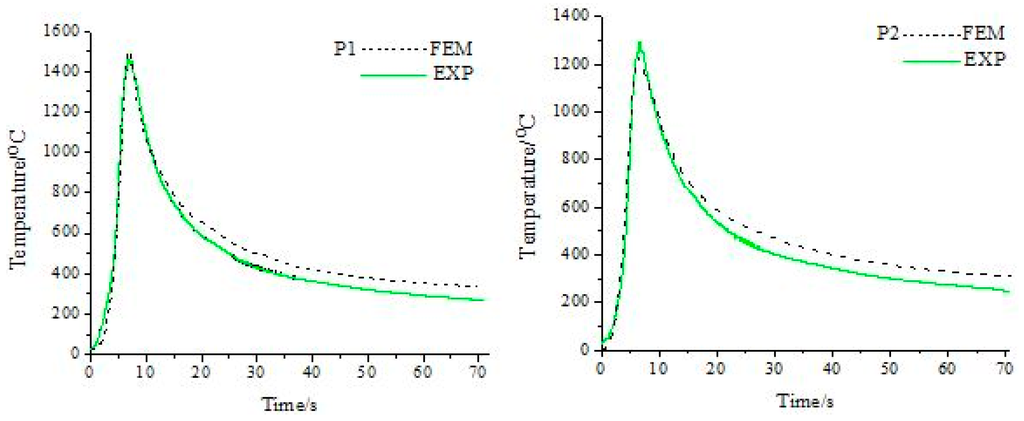 The comparisons between the simulated thermal cycles and experiments of points P1 and P2.