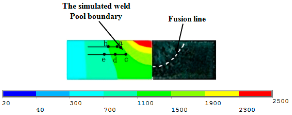 To verify the accuracy of numerical analysis, some welding experiments were performed. Figure 5a,b presents the simulated temperature field and the surface thermal field of the weld joint recorded by infrared thermograph, respectively. U = 11.5 V, and I = 80 A. The welding speed is 100 mm/min. The simulation thermal field and the experiment results have good agreement. To verify the simulation accuracy further, key points P1 and P2 are selected from the fusion line to the base metal to analyze through the infrared thermal image analysis software, IRBIS 3 plus. Figure 5 gives the positions of the points. The positions of P1 and P2 were on the surface of the weld bead. The distance of the points from the fusion line is 0 mm and 0.5 mm, respectively. Figure 6a,b shows the thermal cycles experienced between the simulations and measurements of points P1 and P2. The values of the simulated and measured peak temperatures of P1 are 1500.7 °C and 1462.9 °C, respectively. The values of the simulated and measured peak temperatures of P2 are 1211.1 °C and 1289.7 °C. In addition, the elapsed time above 900 °C and the heating and cooling rate are basically consistent between simulations and measurements. It can be concluded that the simulation has great reliability. Figure 7 shows the comparison of the isotherms across the cross-section of the weld bead obtained by numerical simulation (left side) with respect to the heat marks across the cross-section of the weld bead (right). It is evident that there is good agreement between these two sets of results. In order to analyze the goodness of fit between simulation results and experimental results, the fusion widths of the simulation and experiment were measured separately from the weld surface to the weld bottom. Figure 8 shows the comparison of weld bead widths at different depths of fusion. It can be observed that the two curves basically coincide with each other, and the simulation deviation of the weld width is 7%, which is within the extent of the allowed error.