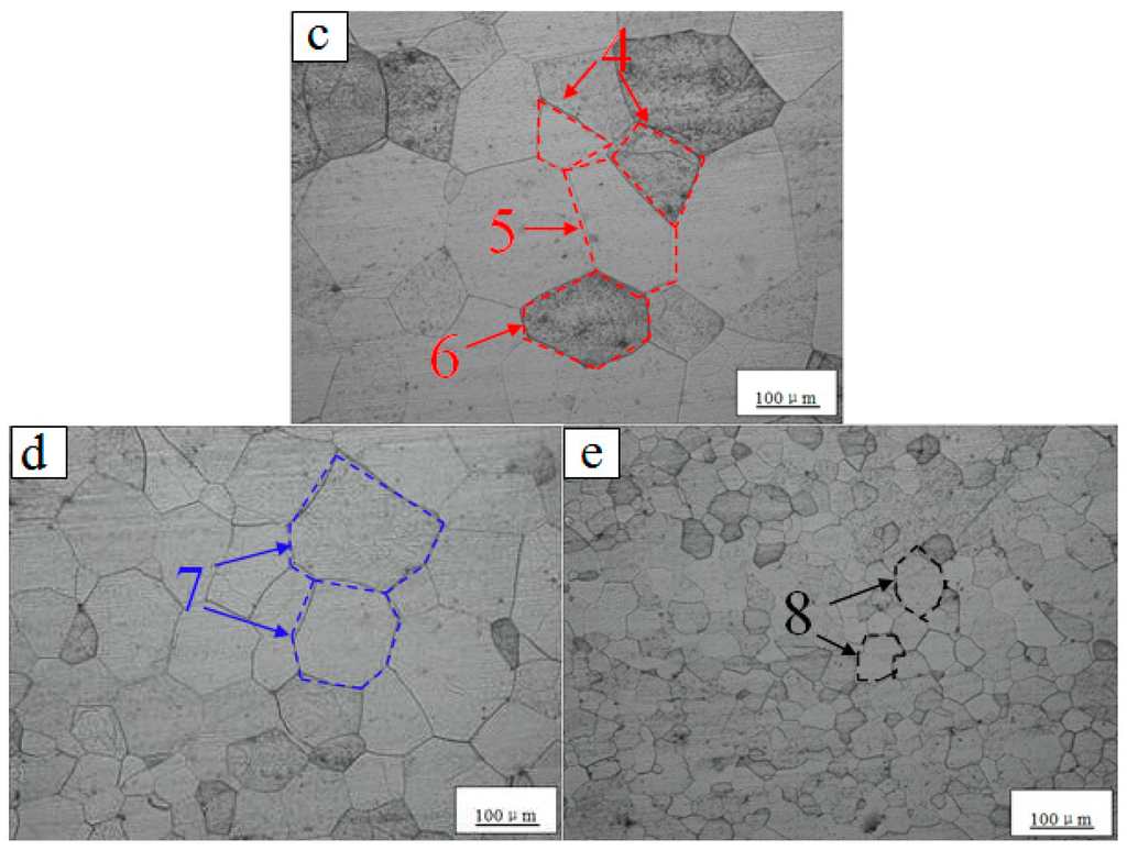 During the welding process, the different points of the weld bead experience different thermal cycles. The microstructure and properties are not uniform. Figure 9 and Figure 10 show the thermal cycles and metallographs of Points c, d, e in Figure 7. The distance between Point c and the fusion line is extremely close. The peak temperature of the thermal cycle experienced is high, about 1500 °C. The peak temperatures of Points d, e decrease. The different heat cycles lead to different microstructures. The grains of the area at the location of Point c near the fusion line grow seriously, shown in Figure 10c. The size decreases gradually along with the increase of the distance from the weld bead, shown in Figure 10d,e. The chromium content in 443 stainless steel reaches 21%, which can accelerate the formation of ferrite strongly. There is no phase transform in the welding process. 443 stainless steel is a kind of high purity steel containing few impurities and almost lacks impure elements. Almost no resistance exists in the process of the grain. Therefore, the main problem during the welding process of 443 stainless steel is grain growth.