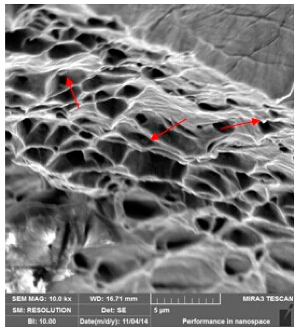 where D0 is the diffusion constant, Q is the diffusion activation energy, R is the gas constant and T is the thermodynamic temperature. From Equation (7), the relationship between diffusion coefficient D and temperature T can be known and is the index. Diffusion coefficient D increases sharply with the increase of temperature. As a result, it can seriously promote the grain growth. Atomic diffusion can influence the grain boundary migration, which also is affected via the boundary structures. From Figure 10, it can be found that the shapes of the grains are mainly quadrilaterals, pentagons and hexagons in Figure 10c, shown as the red dotted line. In Figure 10e, the greatest amounts of grains are made up of heptagons, shown as the blue dotted line. Octagons can be found in Figure 10d, shown as the black dotted line. Grain boundary growth is from rough boundaries to smooth boundaries. When the grain boundary reaches a certain smoothness, the grain growth is stagnant, even at a high temperature. The grain growth is slow even if the boundary is rough below 900 °C. This result also can be confirmed via Figure 11. The same phenomenon also is found similarly in Elizabeth’s research [4]. On the other hand, it is noted that particle precipitation is not found from Figure 10c, and some particle precipitation can be observed from Figure 10d,e. When the mass fraction of chromium is more than fifteen percent, the black carbon compounds will distribute uniformly on the ferrite matrix [19]. As the stabilization elements, titanium elements are contained in the ferritic stainless steel. Therefore, the precipitates on the organization were titanium or niobium intermetallic compounds [20]. These particles are considered to be TiN, TiC or (Nb Ti)C [21,22]. It can be interpreted that when the temperature exceeds 1300 °C, the particles dissolve in ferrites. When the temperature is below 1300 °C, the particles precipitated from the microstructure. The presence of particles can also be verified from the fracture scanning of the weld sample, shown as by the red arrow in Figure 12. The existing particles have a pinning effect on grain growth. The grain grows seriously when the temperature exceeds 1300 °C. This is typical of cases where the distribution of pinning particles dissolves, permitting a reduction in the Zener drag. For 443 ferritic stainless steel, as one kind of ultra-pure ferrite stainless steel, the particle precipitation is little. No phase transformation occurs in the welding process. Consequently, grain boundary migration is the main factor influencing the grain growth in the HAZ. For the coarse grain region, the grain growth can be predicted by the empirical equation under the isothermal condition. The equation can be described as follows [23]: