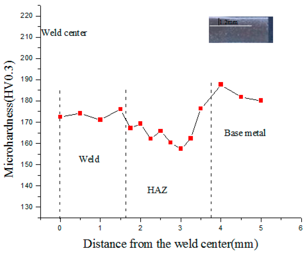 - The microhardness from the weld center to the base metal changed slightly. The lowest microhardness value appeared in the two-phase region, where the highest temperature is from 850 °C to 950 °C. The lowest value is 157.5 HV0.3, softening slightly compared to the base metal.