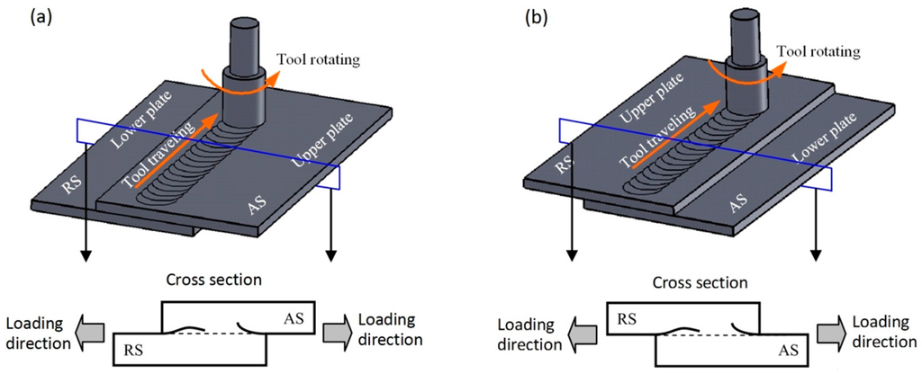 Different loading configurations in friction stir lap welding (FSLW): (a) advancing side (AS) loading; (b) retreating side (RS) loading [9].
