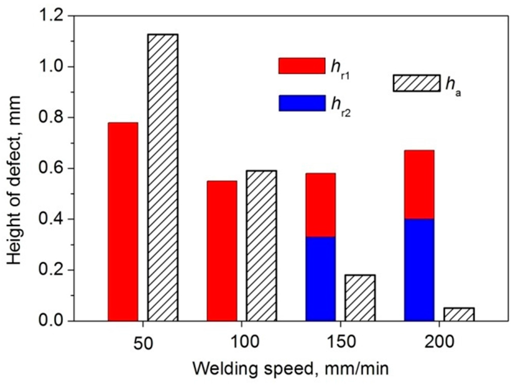 The formation of the defects mentioned above results in the sheet thinning of lap joints. The hook defect only reduces the effective thickness of the top sheet; however, the cold lap defect can not only lead to the effective thickness reduction in the top sheet, but it can also result in the thinning of the bottom sheet when the welding speed is above 150 mm/min (see Figure 2c,d). This is different from that commonly observed in previous investigations, where only the top sheet thinning occurs due to the cold lap defect [6,13,14,15]. In order to quantify the levels of sheet thinning caused by the both defects, Figure 5 plots the height of the hook and cold lap defects, which was measured in the optical microscope. The defect height in both the top and bottom sheets is considered in this paper, and the total height of the hook defect or cold lap defect is defined as the sum of the maximum vertical distance from the defect to the initial faying surface in the top and bottom sheets (i.e., ha for the hook defect and hr1 + hr2 for the cold lap defect, as marked in Figure 3).