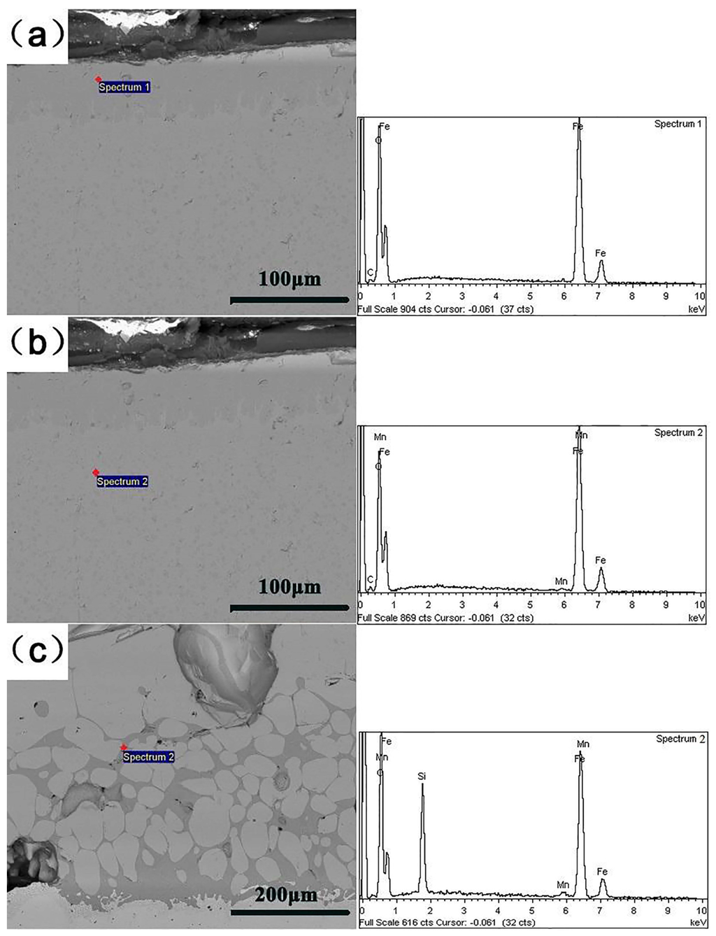 Energy-dispersive spectroscopy (EDS) results of oxide scale for Steel 1. (a) Upper layer; (b) middle layer; (c) inner layer.