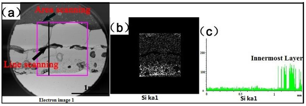 The results of Si distribution in inner scale by line scanning and area scanning. (a) The morphology micrographs of oxide scale; (b) the results of area scanning; (c) the results of line scanning.