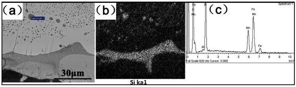 The results of Si distribution in iron matrix near scale by area scanning and energy spectrum. (a) The distribution of Si-containing scale and particles; (b) the results of area scanning; (c) the results of EDS.