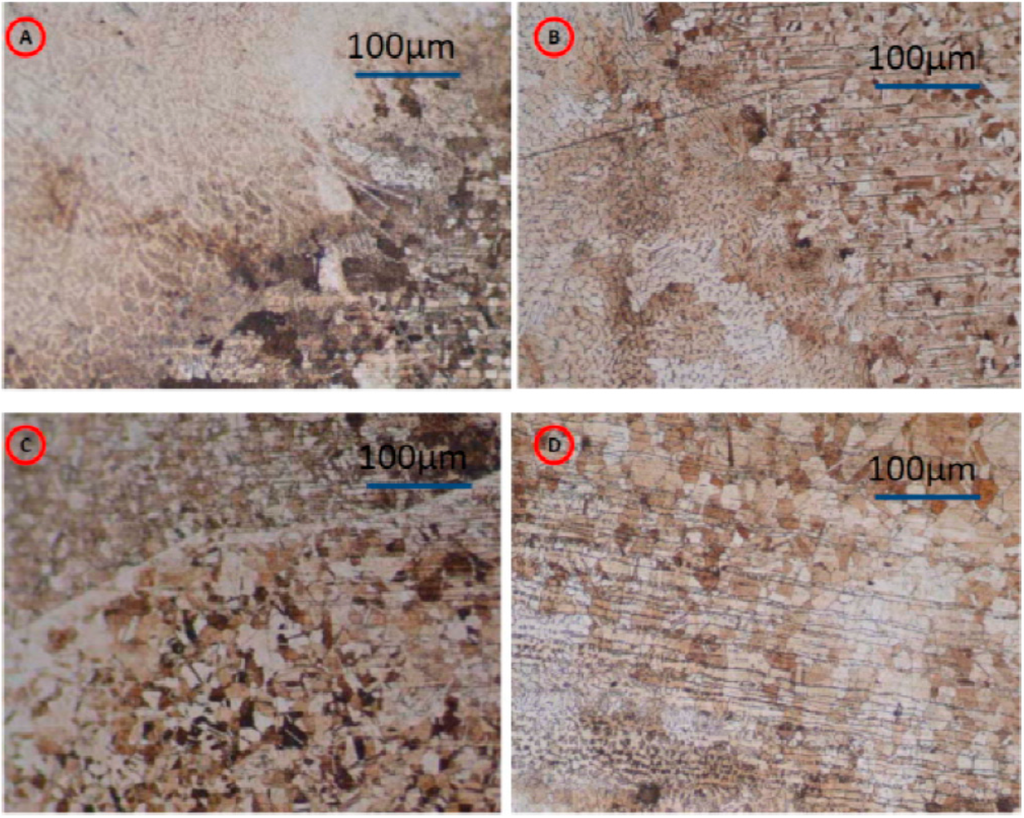 Microstructure of the weld made in an Ar chamber, ×100. Interface WZ-TAZ: (A) not irradiated; (B) at 200 Gy; (C) at 700 Gy; (D) at 1000 Gy.