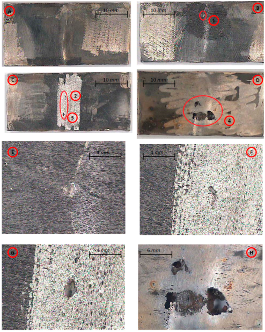 Pitting corrosion test of 304 stainless steel with 316L filler specimens welded in conventional atmosphere: (A) not-irradiated condition; (B) exposed to 200 Gy; (C) to 700 Gy; (D) to 1000 Gy; (E) defect 1 amplification from (B); (F) defect 2 amplification from (C); (G) defect 3 amplification from (C); (H) defect 4 amplification from (D).
