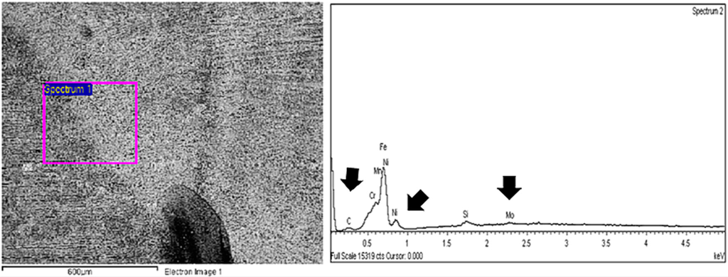 SEM spectrum and micrograph of the AISI 304 steel weld with AISI 316L filler welded in a conventional atmosphere and irradiated at 200 Gy.