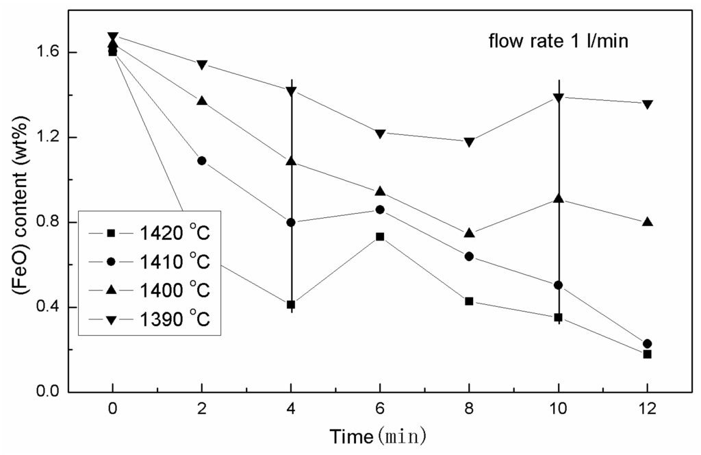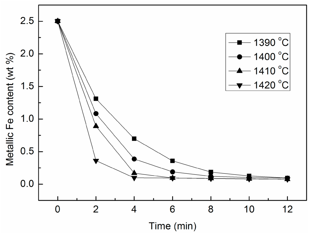As shown in Figure 2, the settling rate of the metallic Fe is much greater at 1390 °C and 1400 °C due to the rapid decrease of viscosity at higher temperatures. Moreover, the oxidation rates of FeO at 1410 °C and 1420 °C are much higher than at 1390 °C and 1400 °C; this is the reason why the variation tendency of the FeO content at higher temperatures is more obvious.