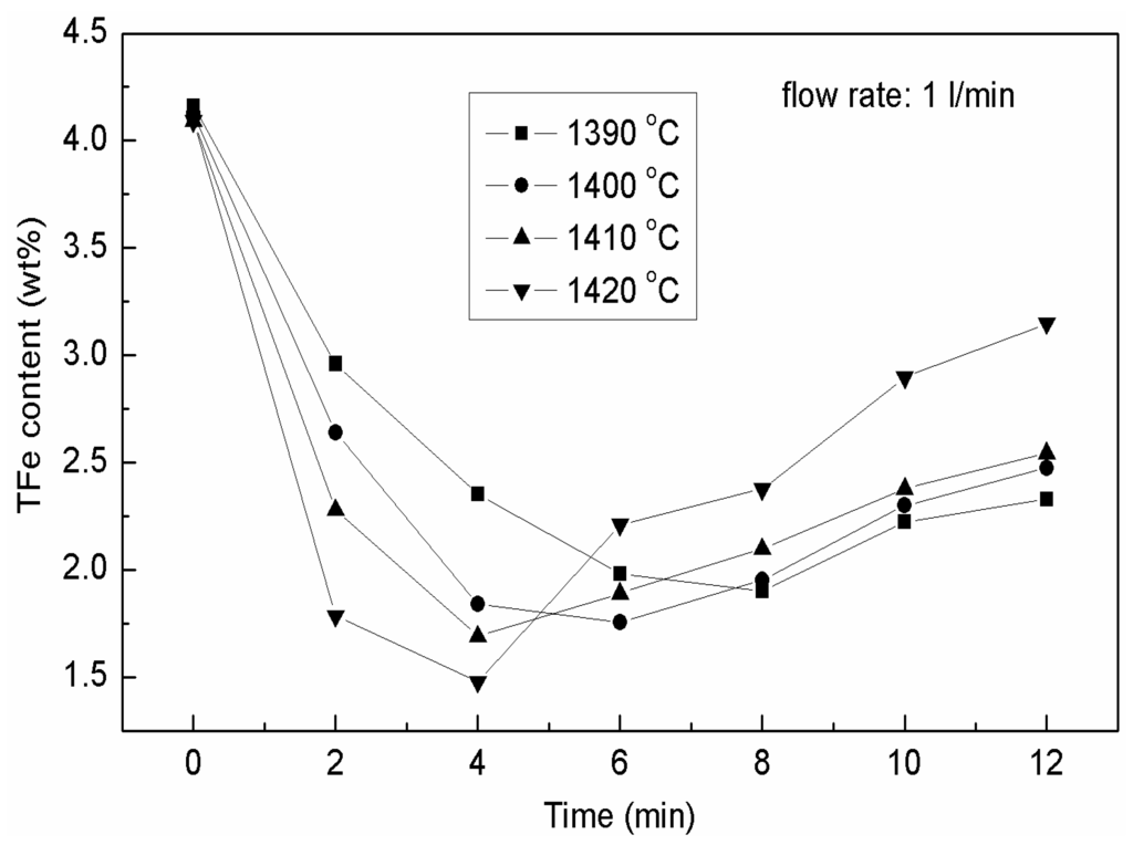 Figure 6 displays the variation of total iron content (FeT) in the slag with oxidation time. The total iron content (TFe) in this work means the combination of element iron, ferrous oxide (FeO), and ferric oxide (Fe2O3).