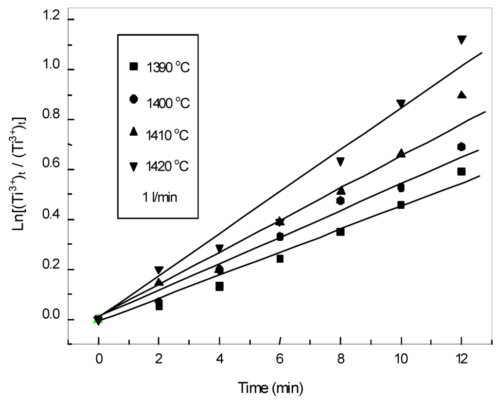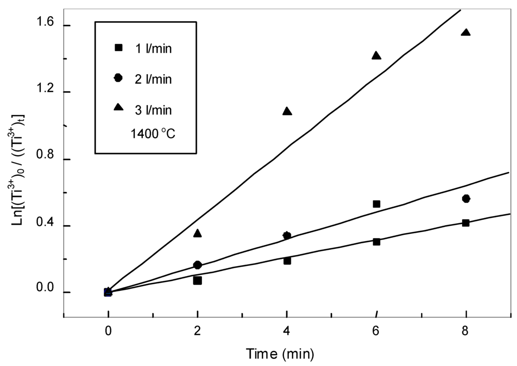 The oxidation rate of low valency titanium can be described as ln[(Ti3+)0/(Ti3+)t] where, (Ti3+)t and (Ti3+)0 represent the content of Ti3+ at time t and zero (initial condition).
