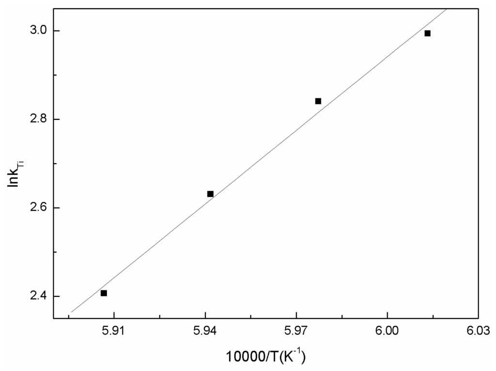 When the activation energy was less than 150 kJ/mol, the diffusion process would be the determining step [17]. On the other hand, the reaction would be controlled by an interfacial reaction if the activation energy is larger than 400 kJ/mol [18]. According to the calculated value of the activation energy, it can be deduced that the oxidation process of Ti3+ in the slag was controlled by chemical reactions between oxygen and (Ti3+) at the interface between the slag and the gas.