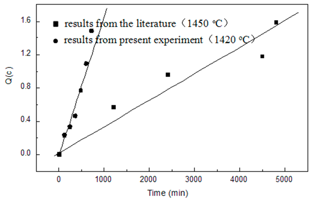 where, cn is the concentration of (Ti3+) on the interface of the slag and oxygen gas, c0 and ct are the concentrations at the initial time and t, respectively; kn is the diffusion rate constant. A comparison between the results obtained in the present work and the literature is shown in Figure 10.